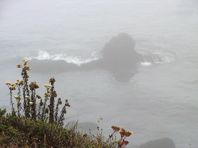 These stones offshore in the fog were incredible; I could have watched them for days if I didn’t have to keep moving. The soundtrack was something from Myst, distant washing waves and an occasional gull’s scree. I shot video too, to try to capture the sound, but it was too subtle for the camera and mostly sounded like a dull hiss, except when cars whoosh by. In three dimensions, the lopsided rhythm of rushing surge and then silence, now over here, now far over there, created an intriguing aural space to go with these looming giant teeth, abstract shapes half shrouded at the outer edge of what can be seen.